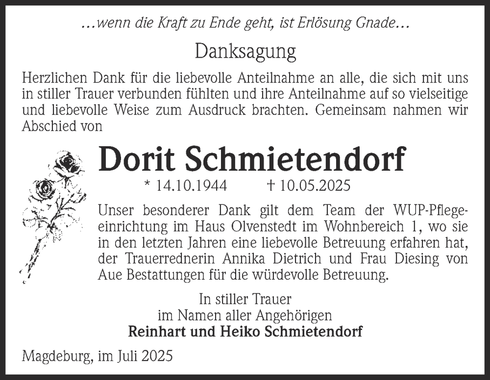 Hier finden Sie alle Traueranzeigen aus der Zeitung, die bisher für Dorit Schmietendorf erschienen sind. Weitere Traueranzeigen, die in der Zeitung erscheinen, werden hier ebenfalls aufgelistet