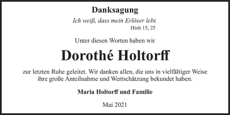 Hier finden Sie alle Traueranzeigen aus der Zeitung, die bisher für Dorothé Holtorff erschienen sind. Weitere Traueranzeigen, die in der Zeitung erscheinen, werden hier ebenfalls aufgelistet