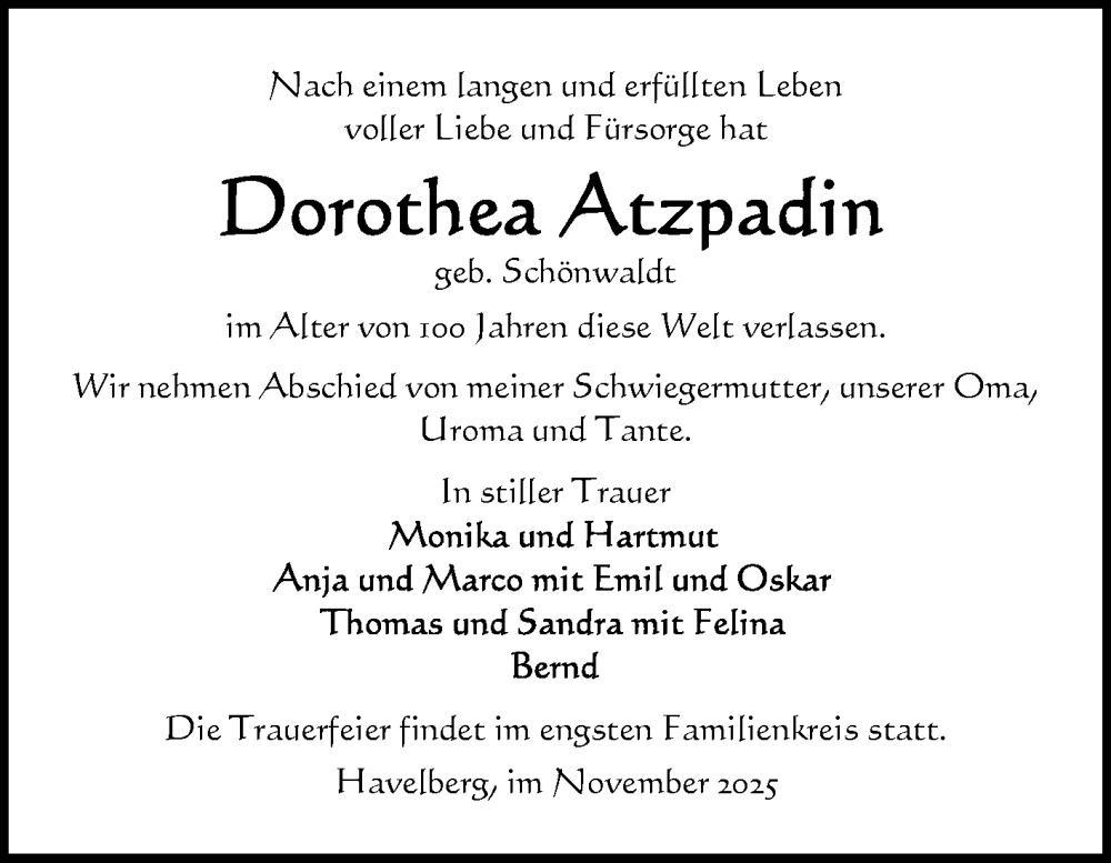 Hier finden Sie alle Traueranzeigen aus der Zeitung, die bisher für Dorothea Atzpadin erschienen sind. Weitere Traueranzeigen, die in der Zeitung erscheinen, werden hier ebenfalls aufgelistet