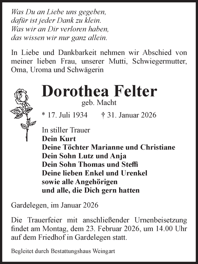 Hier finden Sie alle Traueranzeigen aus der Zeitung, die bisher für Dorothea Felter erschienen sind. Weitere Traueranzeigen, die in der Zeitung erscheinen, werden hier ebenfalls aufgelistet
