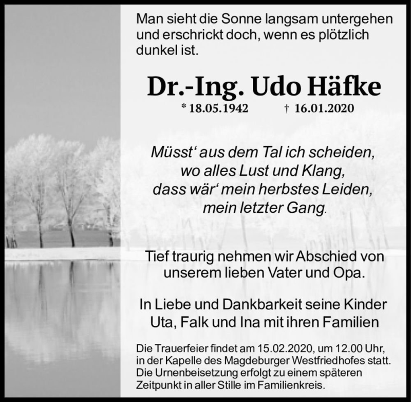 Hier finden Sie alle Traueranzeigen aus der Zeitung, die bisher für Dr.-Ing. Udo Häfke erschienen sind. Weitere Traueranzeigen, die in der Zeitung erscheinen, werden hier ebenfalls aufgelistet