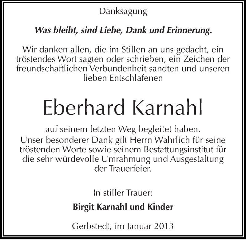 Hier finden Sie alle Traueranzeigen aus der Zeitung, die bisher für Eberhard Karnahl erschienen sind. Weitere Traueranzeigen, die in der Zeitung erscheinen, werden hier ebenfalls aufgelistet
