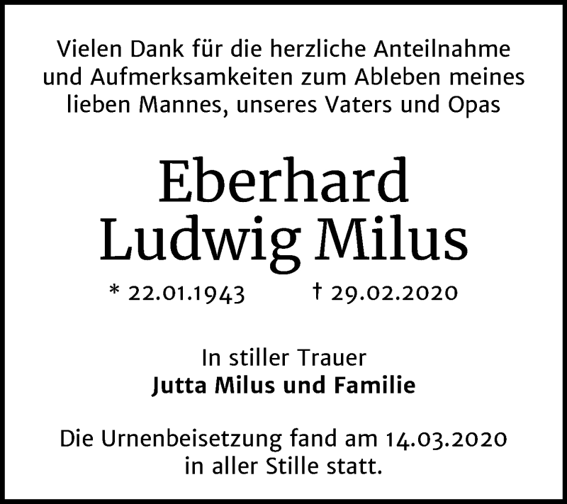 Hier finden Sie alle Traueranzeigen aus der Zeitung, die bisher für Eberhard Ludwig Milus erschienen sind. Weitere Traueranzeigen, die in der Zeitung erscheinen, werden hier ebenfalls aufgelistet