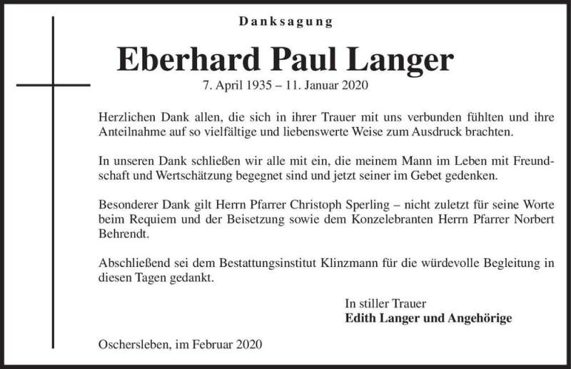 Hier finden Sie alle Traueranzeigen aus der Zeitung, die bisher für Eberhard Paul Langer erschienen sind. Weitere Traueranzeigen, die in der Zeitung erscheinen, werden hier ebenfalls aufgelistet