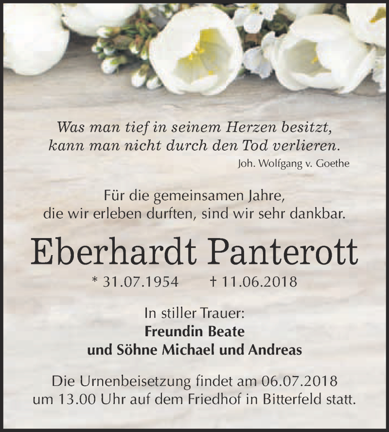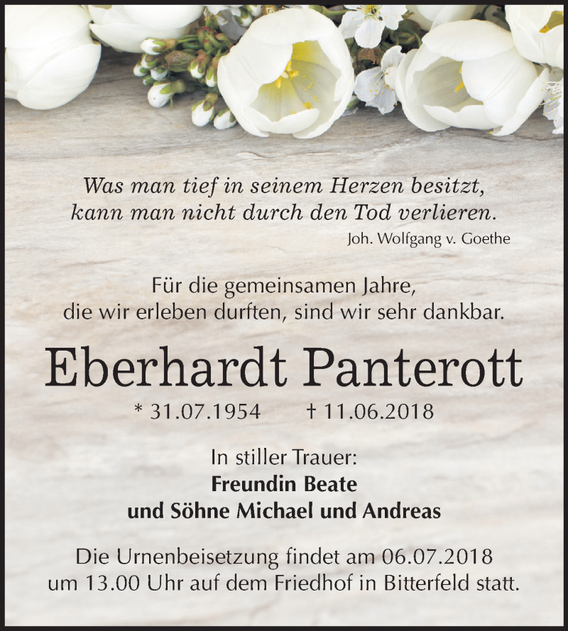 Hier finden Sie alle Traueranzeigen aus der Zeitung, die bisher für Eberhardt Panterott erschienen sind. Weitere Traueranzeigen, die in der Zeitung erscheinen, werden hier ebenfalls aufgelistet