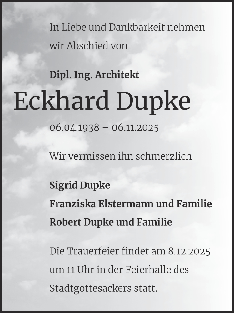 Hier finden Sie alle Traueranzeigen aus der Zeitung, die bisher für Eckhard Dupke erschienen sind. Weitere Traueranzeigen, die in der Zeitung erscheinen, werden hier ebenfalls aufgelistet