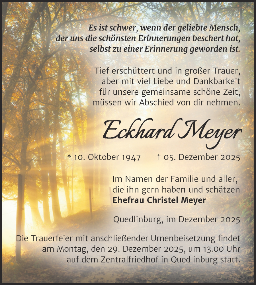 Hier finden Sie alle Traueranzeigen aus der Zeitung, die bisher für Eckhard Meyer erschienen sind. Weitere Traueranzeigen, die in der Zeitung erscheinen, werden hier ebenfalls aufgelistet