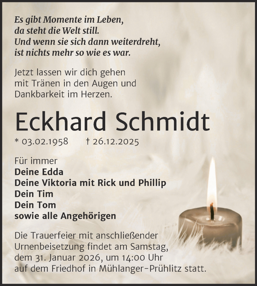 Hier finden Sie alle Traueranzeigen aus der Zeitung, die bisher für Eckhard Schmidt erschienen sind. Weitere Traueranzeigen, die in der Zeitung erscheinen, werden hier ebenfalls aufgelistet