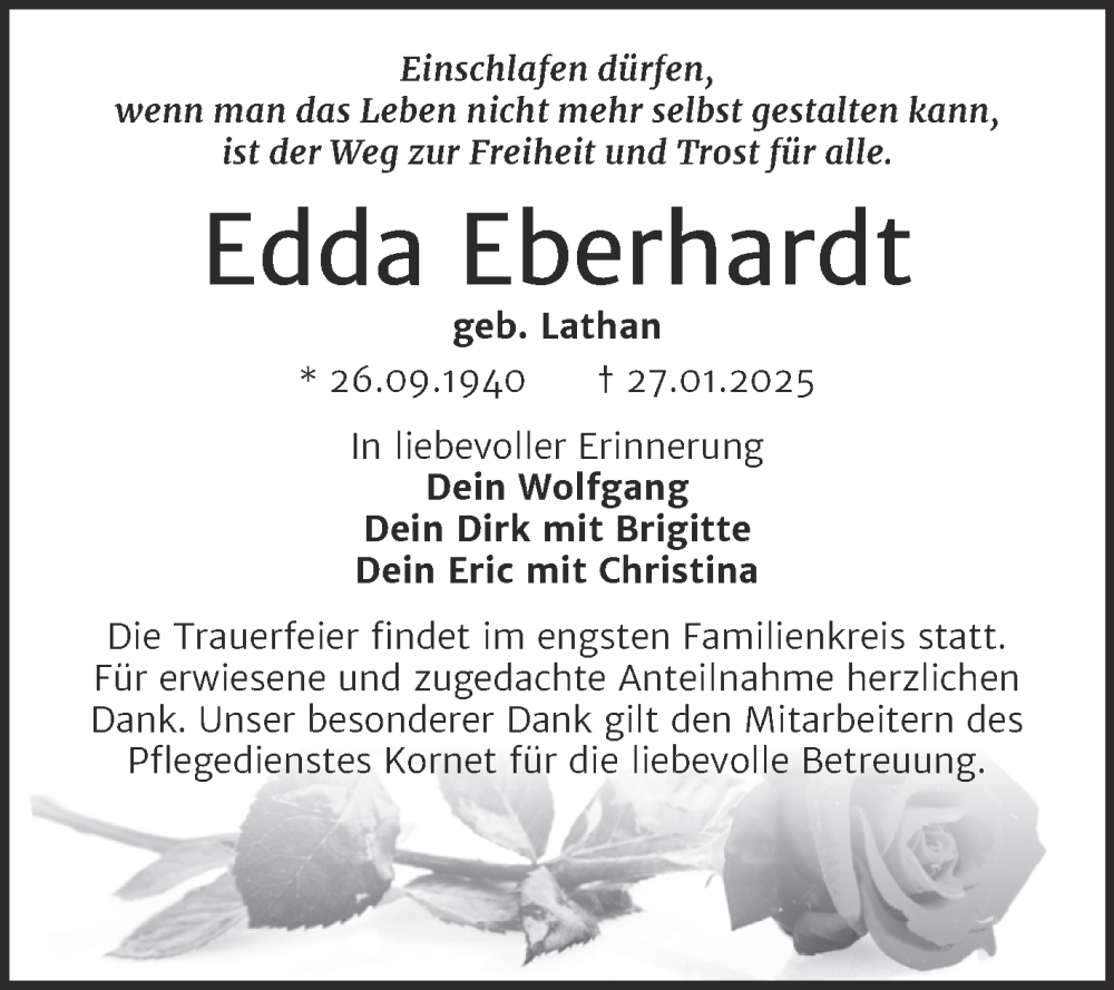 Hier finden Sie alle Traueranzeigen aus der Zeitung, die bisher für Edda Eberhardt erschienen sind. Weitere Traueranzeigen, die in der Zeitung erscheinen, werden hier ebenfalls aufgelistet