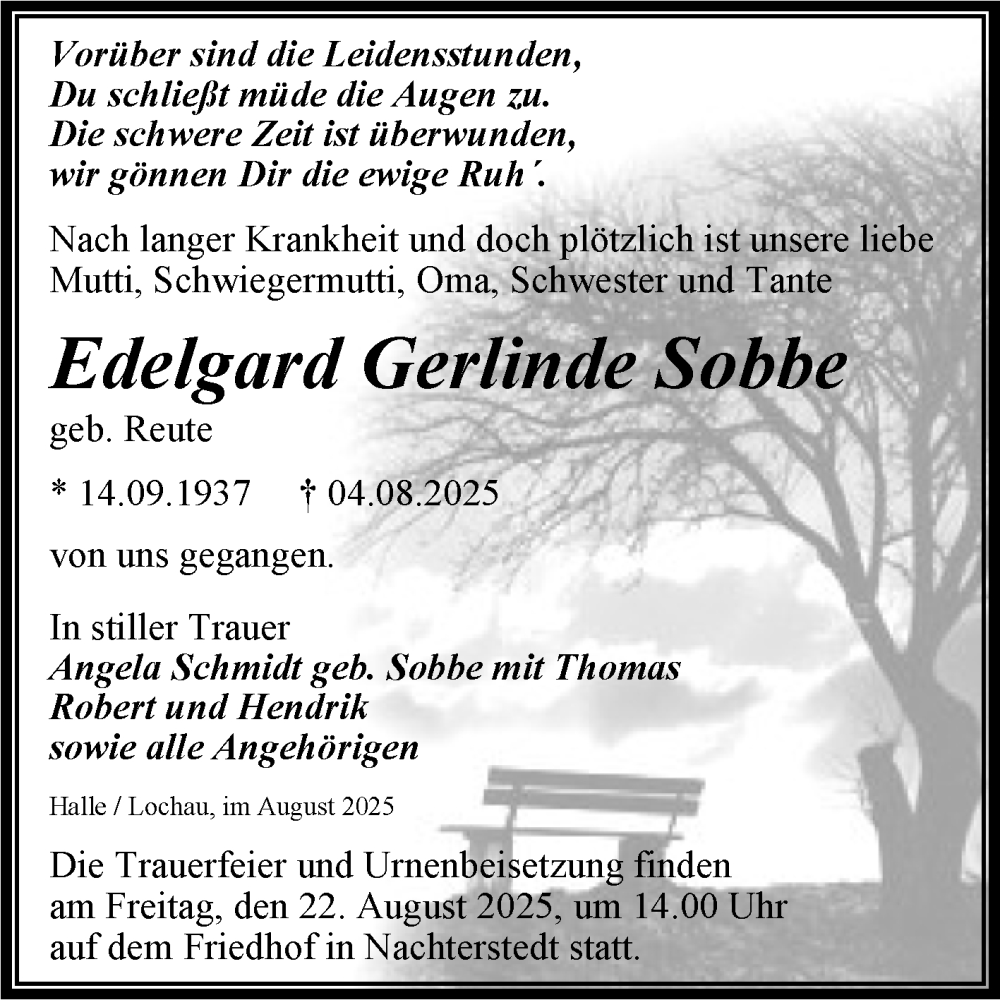 Hier finden Sie alle Traueranzeigen aus der Zeitung, die bisher für Edelgard Gerlinde Sobbe erschienen sind. Weitere Traueranzeigen, die in der Zeitung erscheinen, werden hier ebenfalls aufgelistet