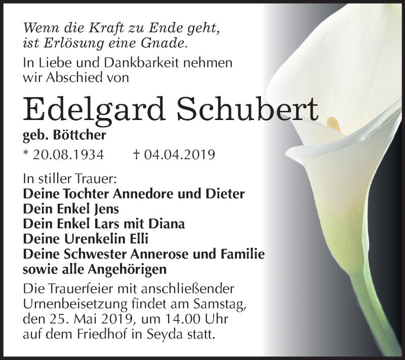 Hier finden Sie alle Traueranzeigen aus der Zeitung, die bisher für Edelgard Schubert erschienen sind. Weitere Traueranzeigen, die in der Zeitung erscheinen, werden hier ebenfalls aufgelistet