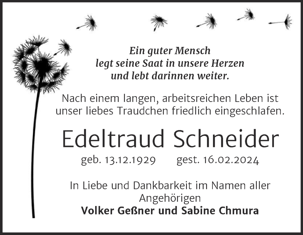 Hier finden Sie alle Traueranzeigen aus der Zeitung, die bisher für Edeltraud Schneider erschienen sind. Weitere Traueranzeigen, die in der Zeitung erscheinen, werden hier ebenfalls aufgelistet