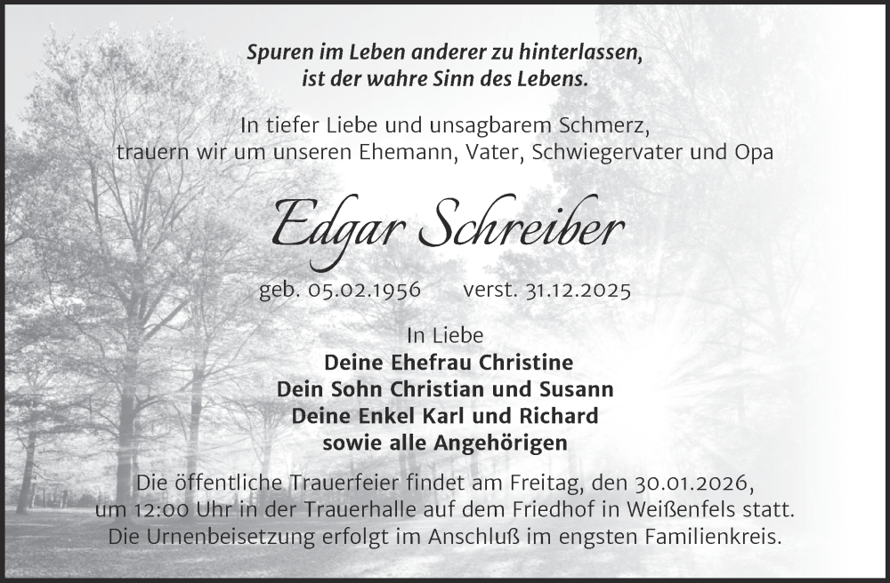 Hier finden Sie alle Traueranzeigen aus der Zeitung, die bisher für Edgar Schreiber erschienen sind. Weitere Traueranzeigen, die in der Zeitung erscheinen, werden hier ebenfalls aufgelistet