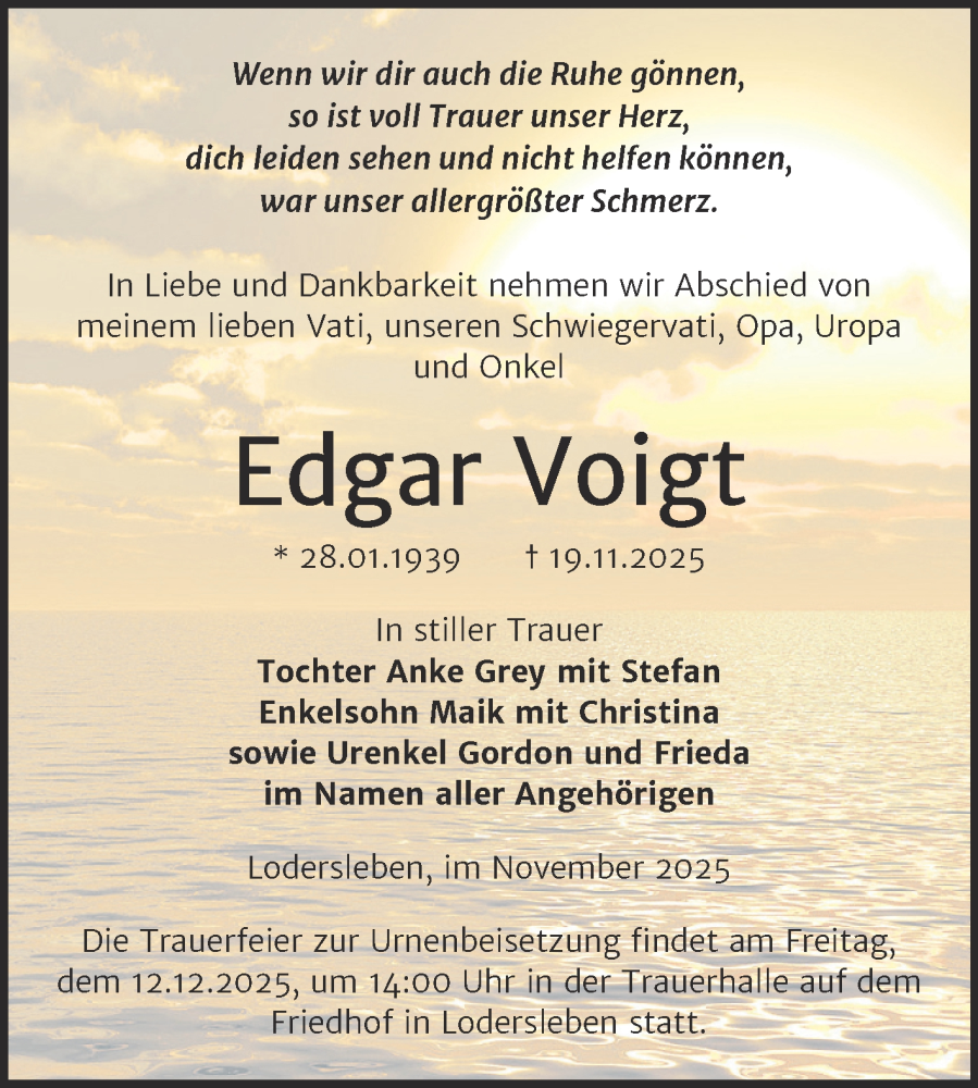 Hier finden Sie alle Traueranzeigen aus der Zeitung, die bisher für Edgar Voigt erschienen sind. Weitere Traueranzeigen, die in der Zeitung erscheinen, werden hier ebenfalls aufgelistet