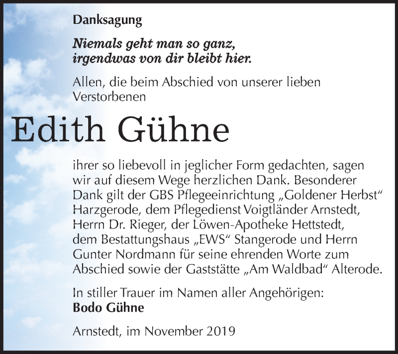 Hier finden Sie alle Traueranzeigen aus der Zeitung, die bisher für Edith Gühne erschienen sind. Weitere Traueranzeigen, die in der Zeitung erscheinen, werden hier ebenfalls aufgelistet