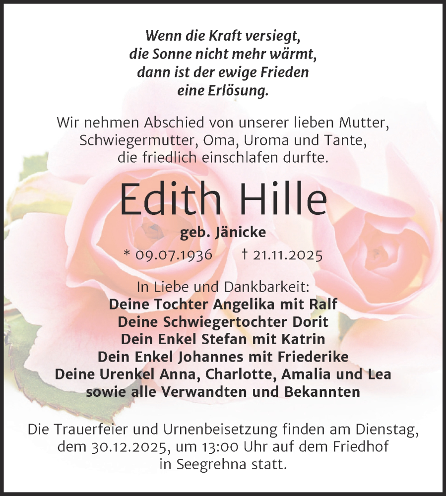 Hier finden Sie alle Traueranzeigen aus der Zeitung, die bisher für Edith Hille erschienen sind. Weitere Traueranzeigen, die in der Zeitung erscheinen, werden hier ebenfalls aufgelistet