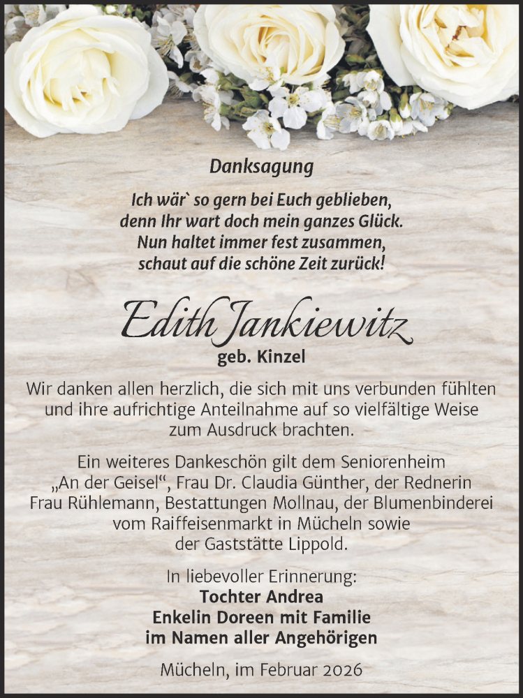 Hier finden Sie alle Traueranzeigen aus der Zeitung, die bisher für Edith Jankiewitz erschienen sind. Weitere Traueranzeigen, die in der Zeitung erscheinen, werden hier ebenfalls aufgelistet
