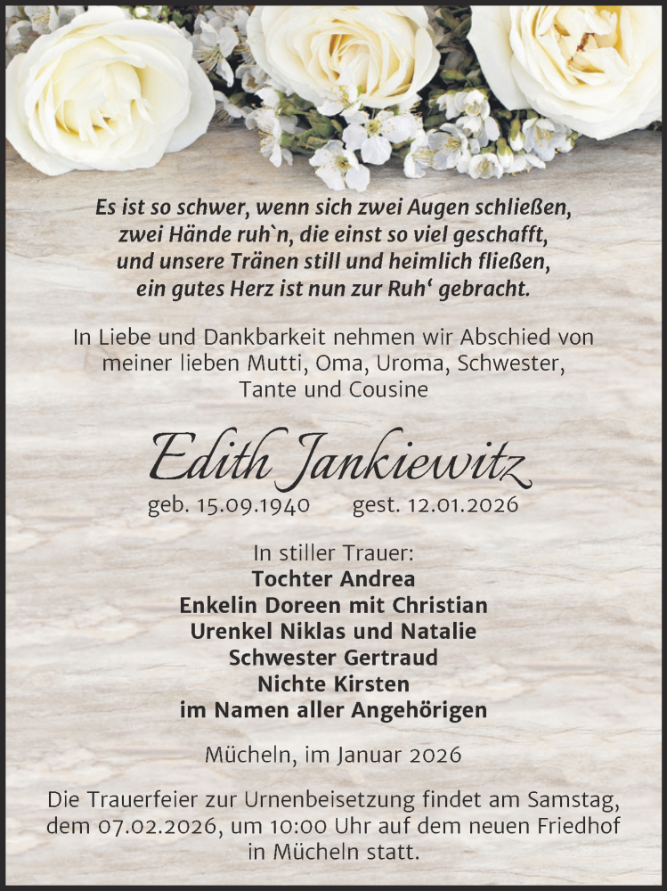 Hier finden Sie alle Traueranzeigen aus der Zeitung, die bisher für Edith Jankiewitz erschienen sind. Weitere Traueranzeigen, die in der Zeitung erscheinen, werden hier ebenfalls aufgelistet