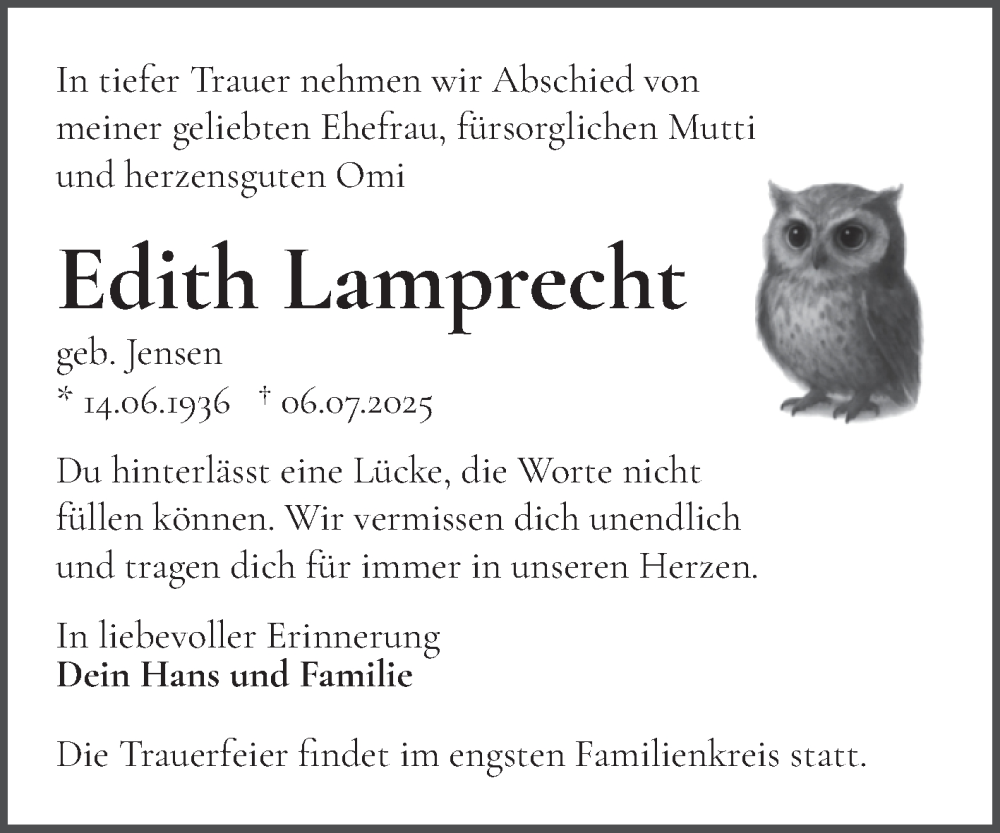 Hier finden Sie alle Traueranzeigen aus der Zeitung, die bisher für Edith Lamprecht erschienen sind. Weitere Traueranzeigen, die in der Zeitung erscheinen, werden hier ebenfalls aufgelistet