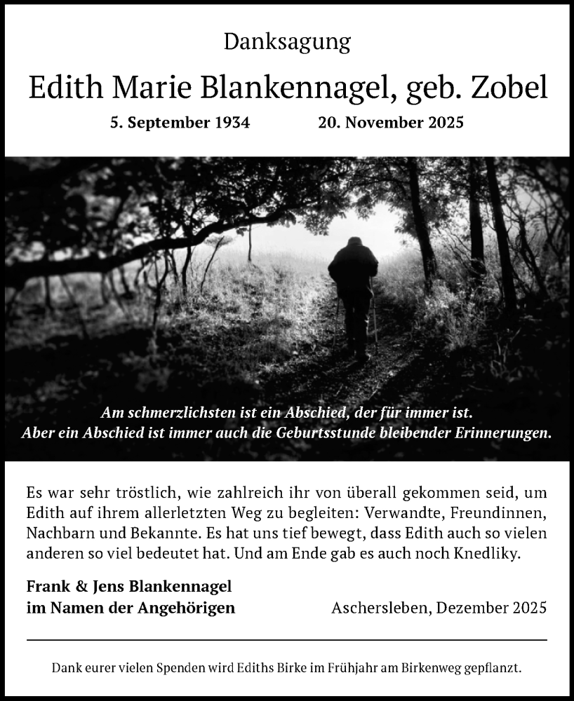 Hier finden Sie alle Traueranzeigen aus der Zeitung, die bisher für Edith Marie Blankennagel erschienen sind. Weitere Traueranzeigen, die in der Zeitung erscheinen, werden hier ebenfalls aufgelistet