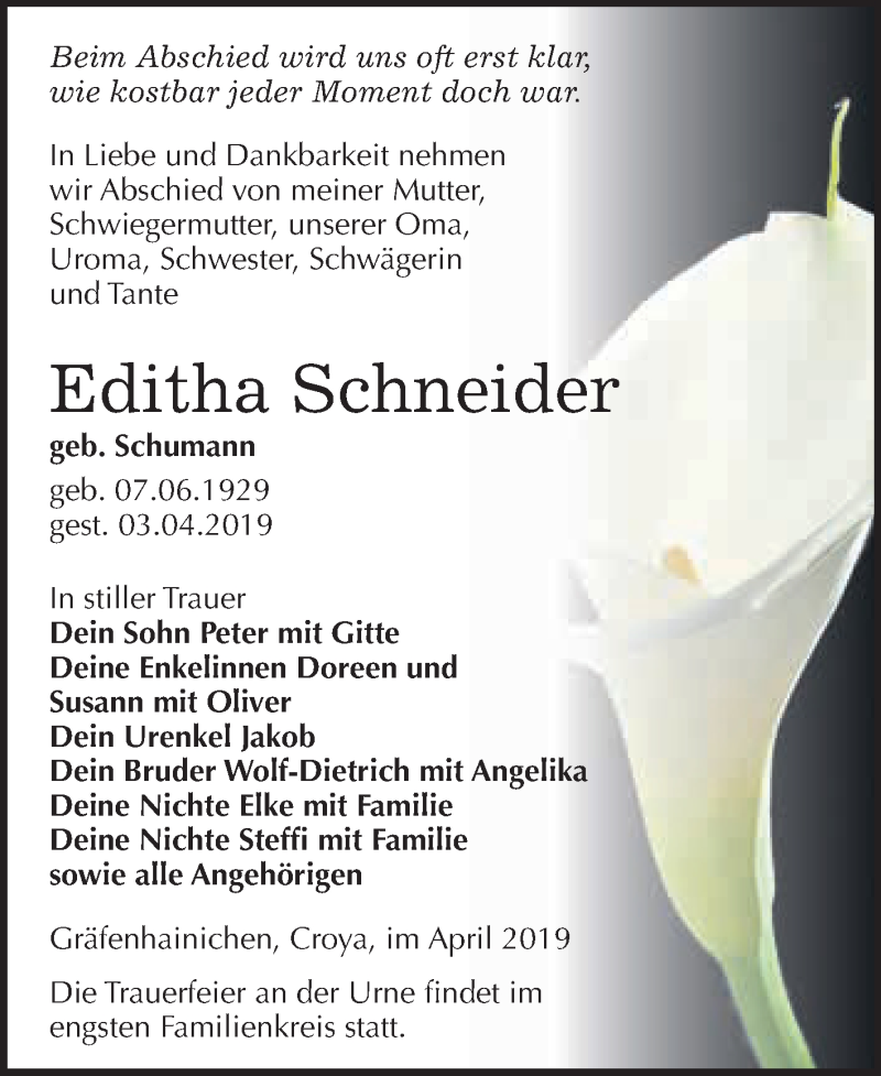 Hier finden Sie alle Traueranzeigen aus der Zeitung, die bisher für Editha Schneider erschienen sind. Weitere Traueranzeigen, die in der Zeitung erscheinen, werden hier ebenfalls aufgelistet