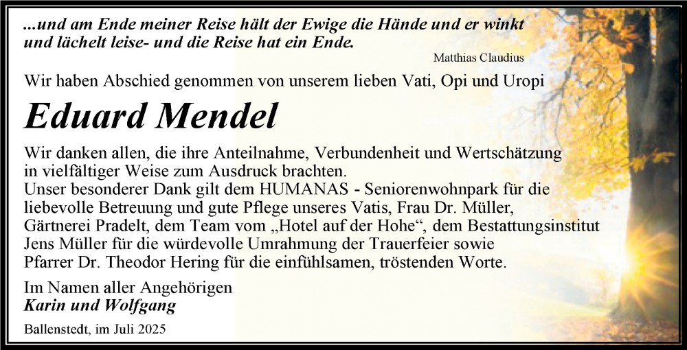 Hier finden Sie alle Traueranzeigen aus der Zeitung, die bisher für Eduard Mendel erschienen sind. Weitere Traueranzeigen, die in der Zeitung erscheinen, werden hier ebenfalls aufgelistet