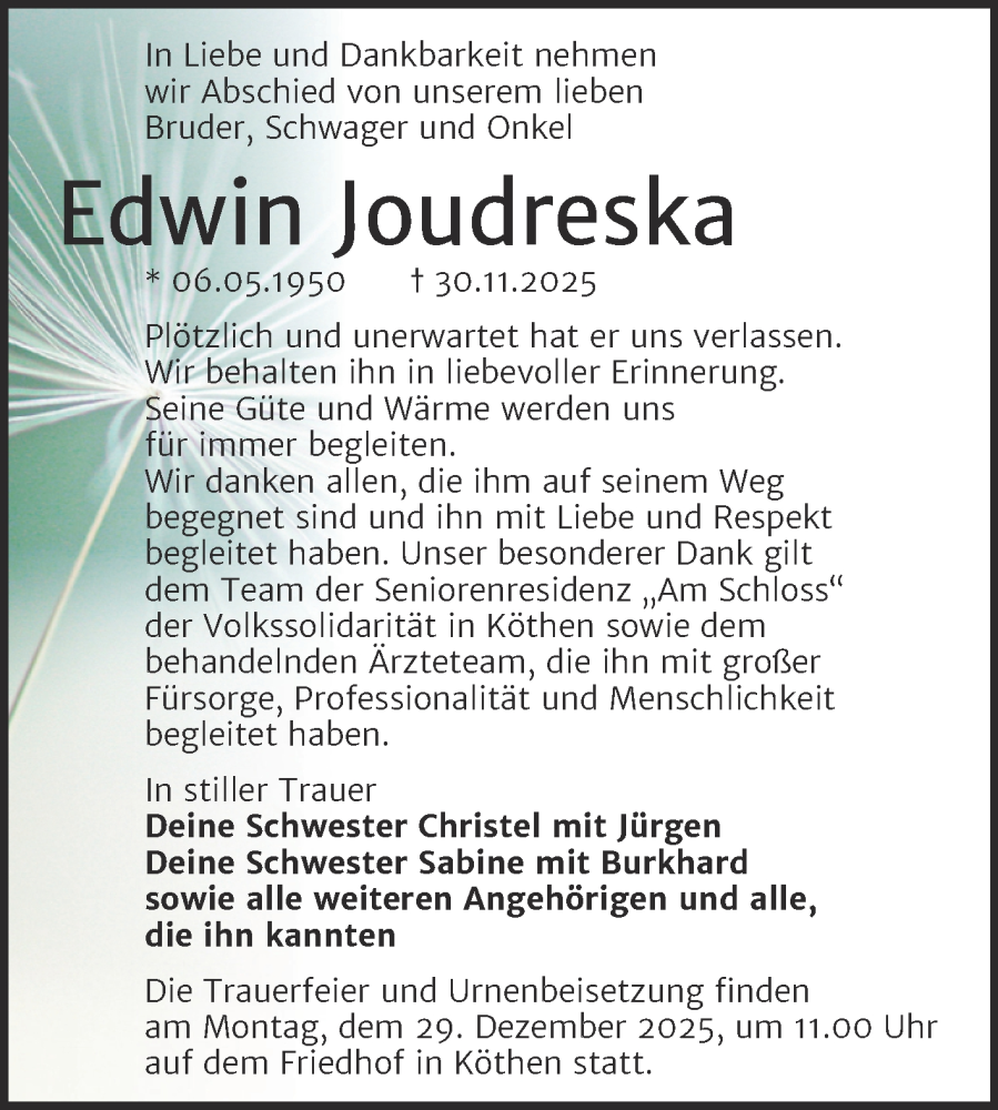 Hier finden Sie alle Traueranzeigen aus der Zeitung, die bisher für Edwin Joudreska erschienen sind. Weitere Traueranzeigen, die in der Zeitung erscheinen, werden hier ebenfalls aufgelistet