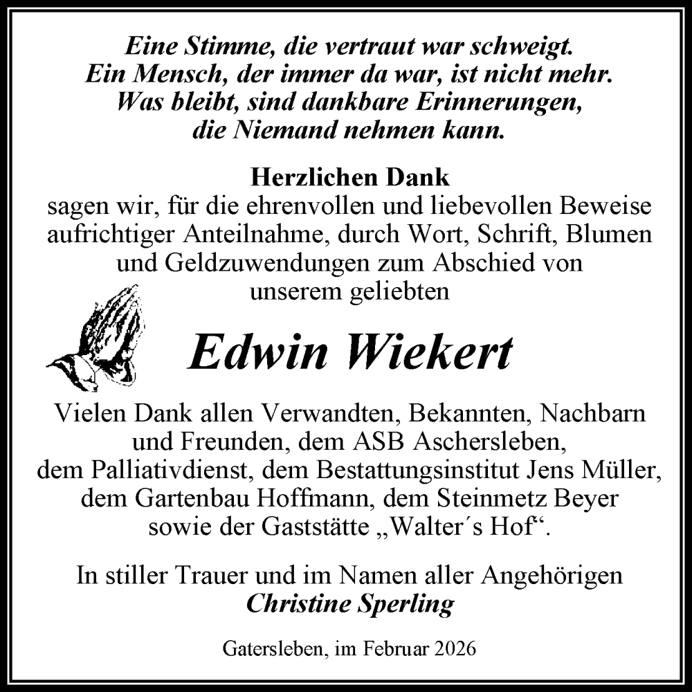 Hier finden Sie alle Traueranzeigen aus der Zeitung, die bisher für Edwin Wiekert erschienen sind. Weitere Traueranzeigen, die in der Zeitung erscheinen, werden hier ebenfalls aufgelistet