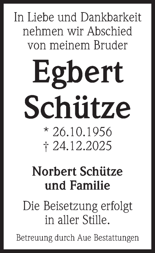 Hier finden Sie alle Traueranzeigen aus der Zeitung, die bisher für Egbert Schütze erschienen sind. Weitere Traueranzeigen, die in der Zeitung erscheinen, werden hier ebenfalls aufgelistet