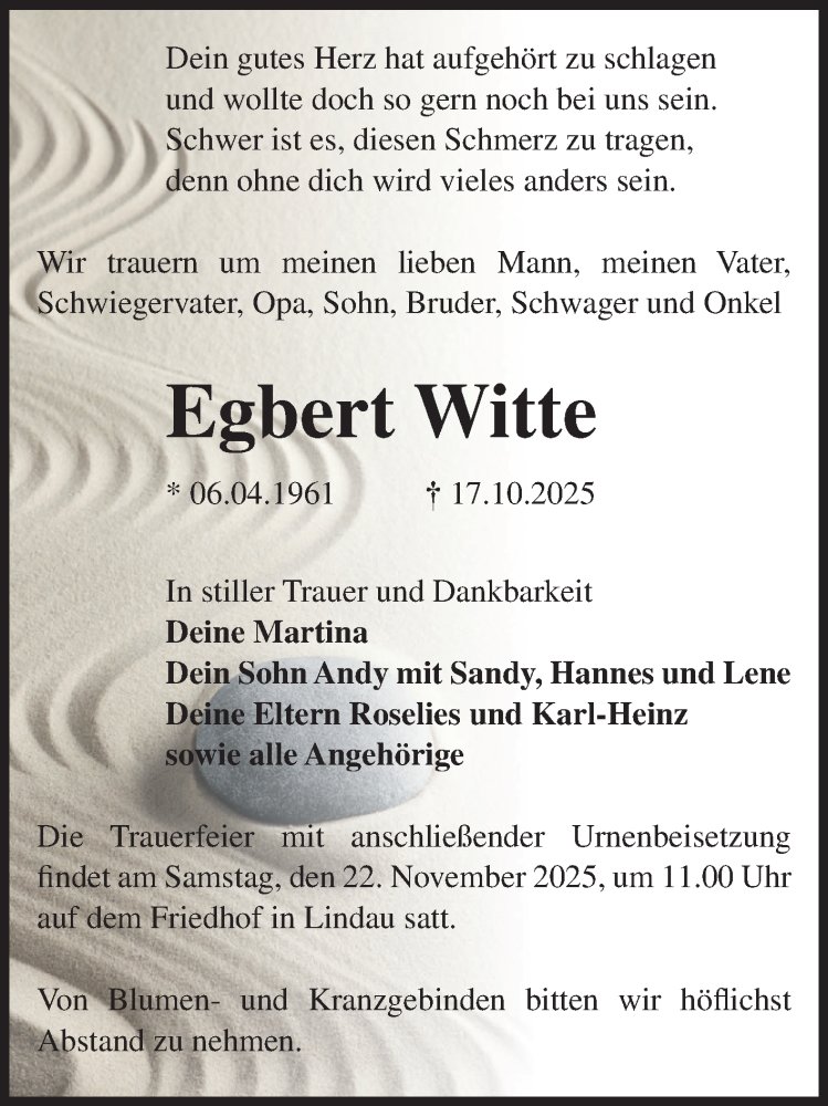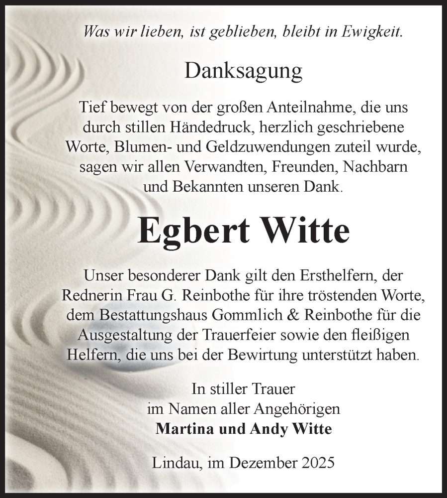 Hier finden Sie alle Traueranzeigen aus der Zeitung, die bisher für Egbert Witte erschienen sind. Weitere Traueranzeigen, die in der Zeitung erscheinen, werden hier ebenfalls aufgelistet