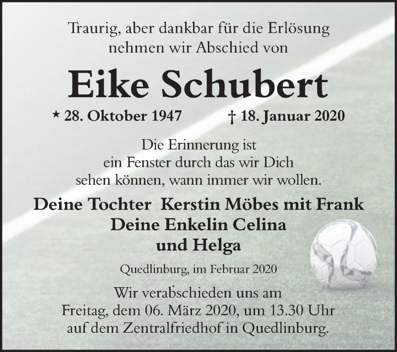 Hier finden Sie alle Traueranzeigen aus der Zeitung, die bisher für Eike Schubert erschienen sind. Weitere Traueranzeigen, die in der Zeitung erscheinen, werden hier ebenfalls aufgelistet