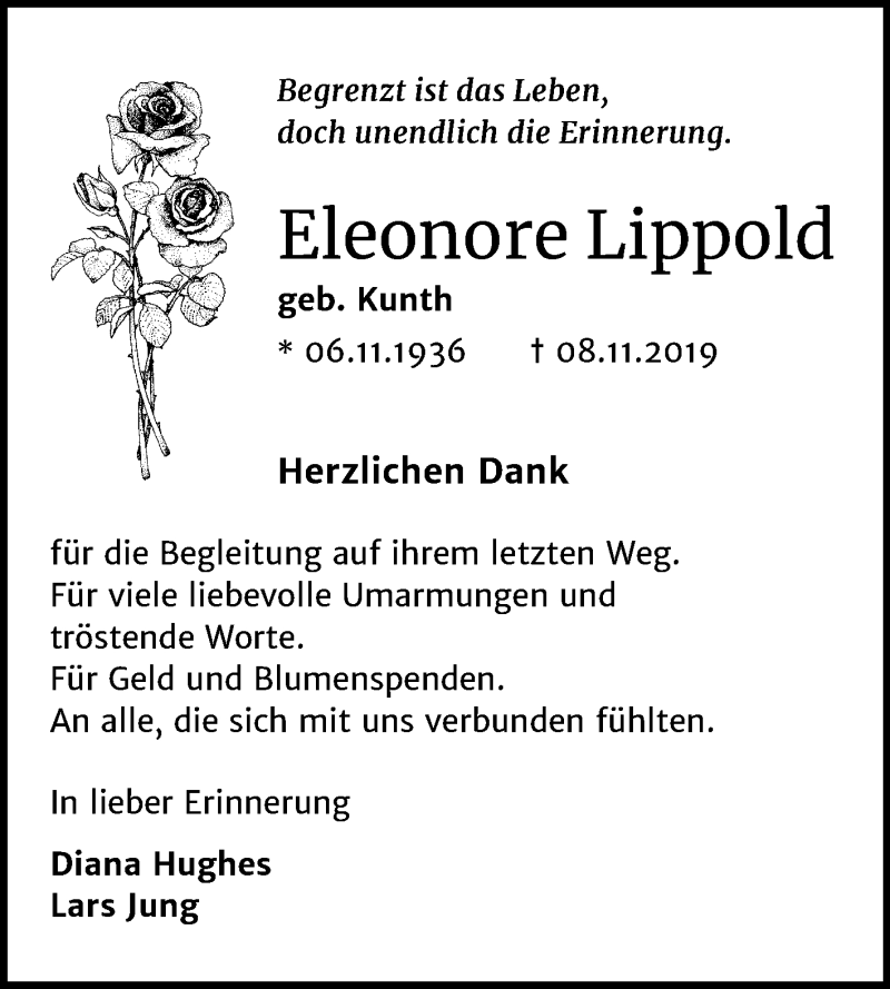 Hier finden Sie alle Traueranzeigen aus der Zeitung, die bisher für Eleonore Lippold erschienen sind. Weitere Traueranzeigen, die in der Zeitung erscheinen, werden hier ebenfalls aufgelistet