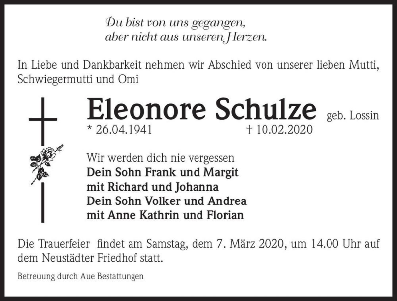 Hier finden Sie alle Traueranzeigen aus der Zeitung, die bisher für Eleonore Schulze (geb. Lossin) erschienen sind. Weitere Traueranzeigen, die in der Zeitung erscheinen, werden hier ebenfalls aufgelistet