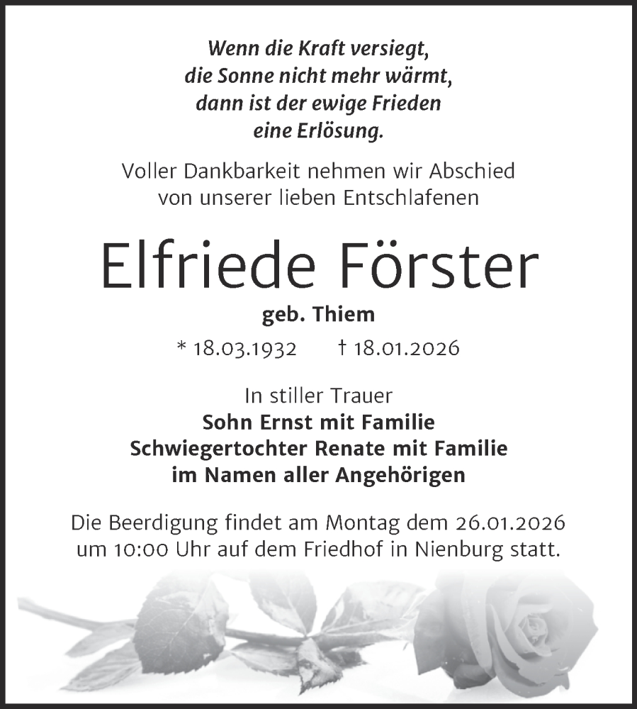Hier finden Sie alle Traueranzeigen aus der Zeitung, die bisher für Elfriede Förster erschienen sind. Weitere Traueranzeigen, die in der Zeitung erscheinen, werden hier ebenfalls aufgelistet