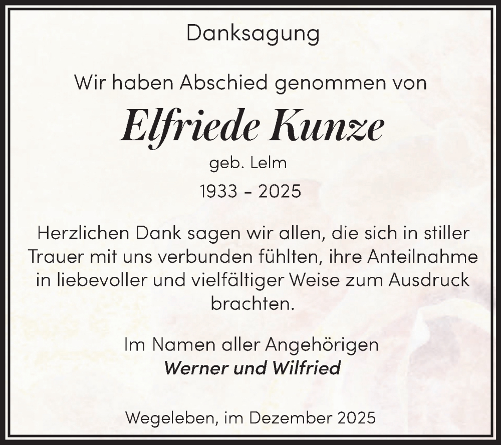 Hier finden Sie alle Traueranzeigen aus der Zeitung, die bisher für Elfriede Kunze erschienen sind. Weitere Traueranzeigen, die in der Zeitung erscheinen, werden hier ebenfalls aufgelistet