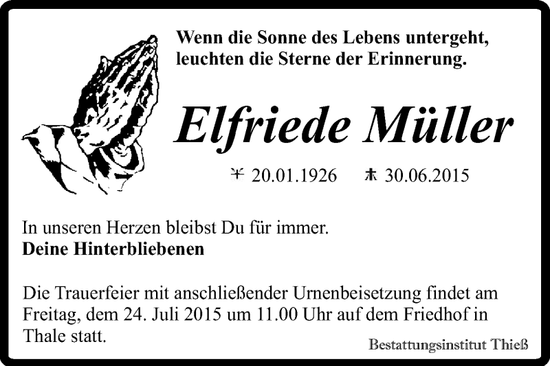 Hier finden Sie alle Traueranzeigen aus der Zeitung, die bisher für Elfriede Müller erschienen sind. Weitere Traueranzeigen, die in der Zeitung erscheinen, werden hier ebenfalls aufgelistet