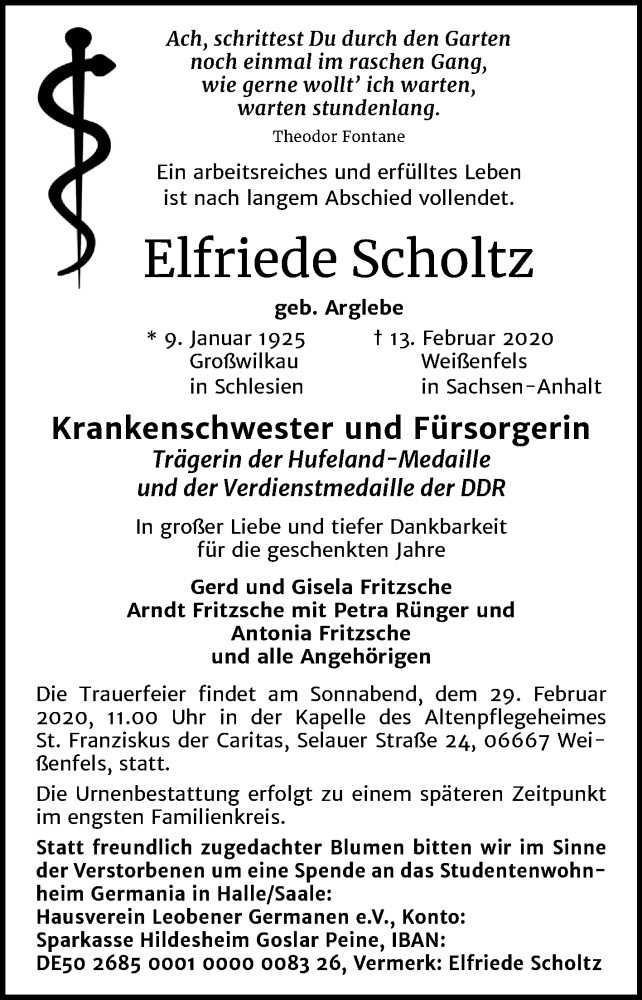 Hier finden Sie alle Traueranzeigen aus der Zeitung, die bisher für Elfriede Scholtz erschienen sind. Weitere Traueranzeigen, die in der Zeitung erscheinen, werden hier ebenfalls aufgelistet