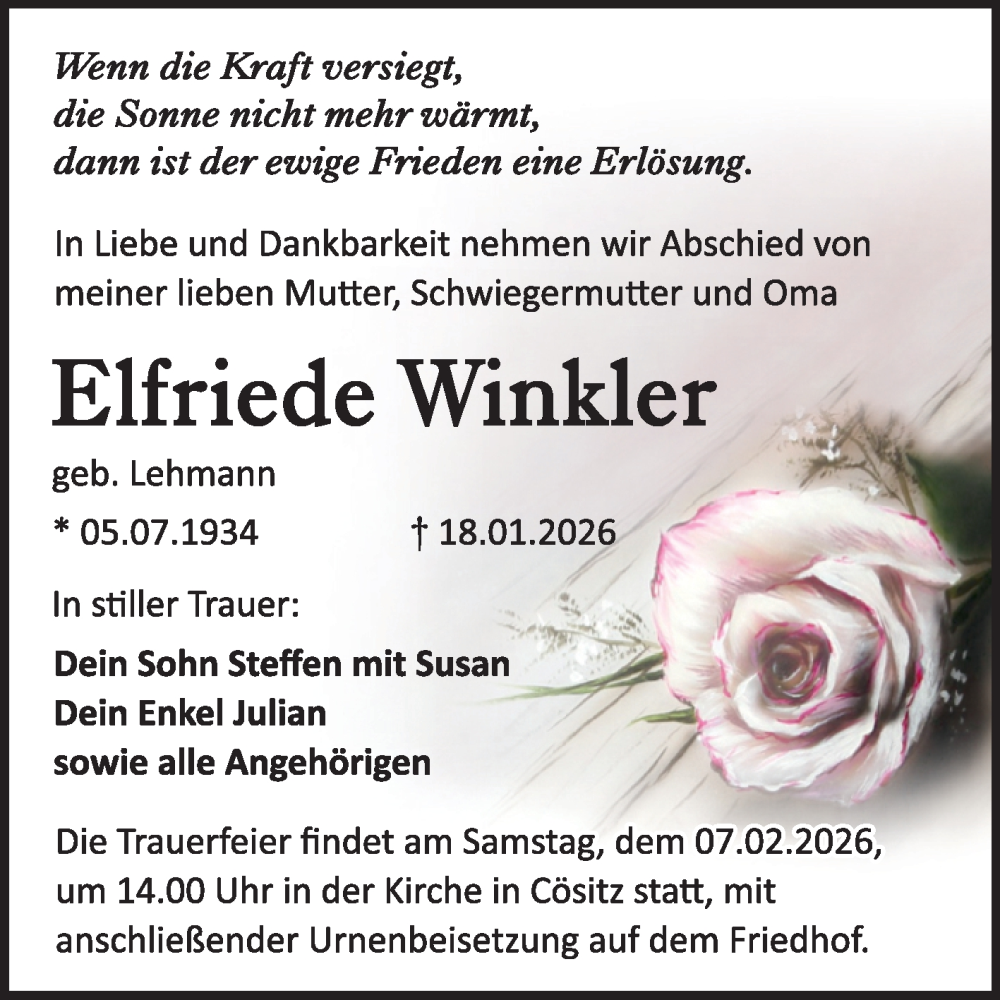 Hier finden Sie alle Traueranzeigen aus der Zeitung, die bisher für Elfriede Winkler erschienen sind. Weitere Traueranzeigen, die in der Zeitung erscheinen, werden hier ebenfalls aufgelistet