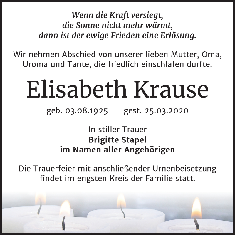 Hier finden Sie alle Traueranzeigen aus der Zeitung, die bisher für Elisabeth Krause erschienen sind. Weitere Traueranzeigen, die in der Zeitung erscheinen, werden hier ebenfalls aufgelistet