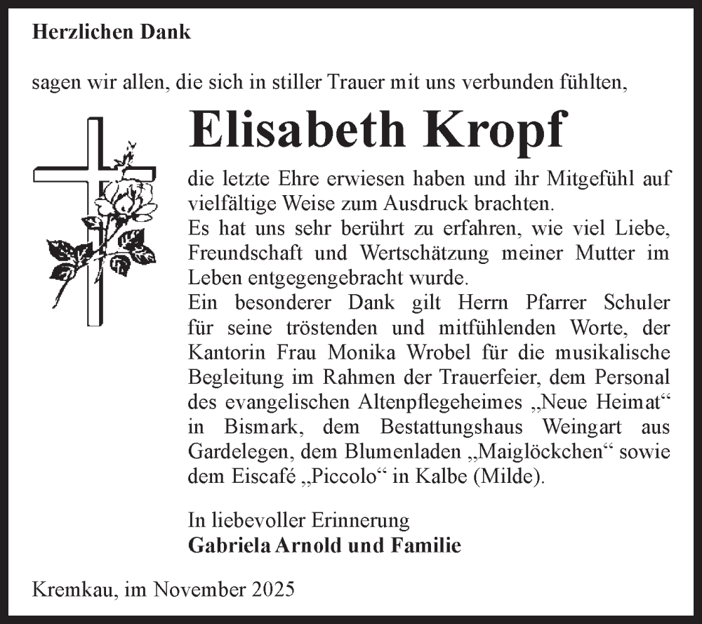 Hier finden Sie alle Traueranzeigen aus der Zeitung, die bisher für Elisabeth Kropf erschienen sind. Weitere Traueranzeigen, die in der Zeitung erscheinen, werden hier ebenfalls aufgelistet
