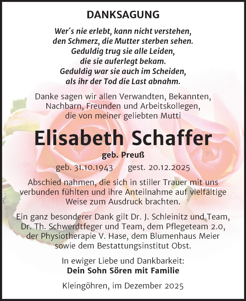 Hier finden Sie alle Traueranzeigen aus der Zeitung, die bisher für Elisabeth Schaffer erschienen sind. Weitere Traueranzeigen, die in der Zeitung erscheinen, werden hier ebenfalls aufgelistet