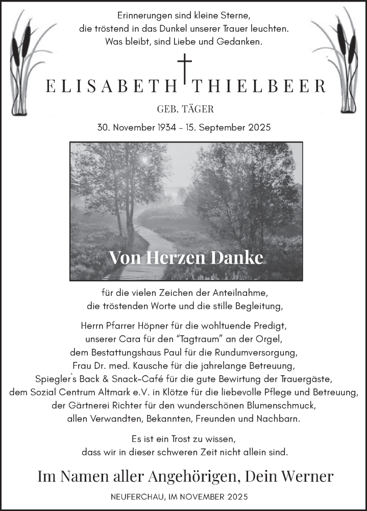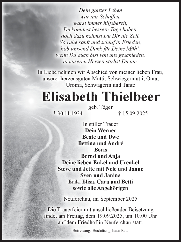 Hier finden Sie alle Traueranzeigen aus der Zeitung, die bisher für Elisabeth Thielbeer erschienen sind. Weitere Traueranzeigen, die in der Zeitung erscheinen, werden hier ebenfalls aufgelistet