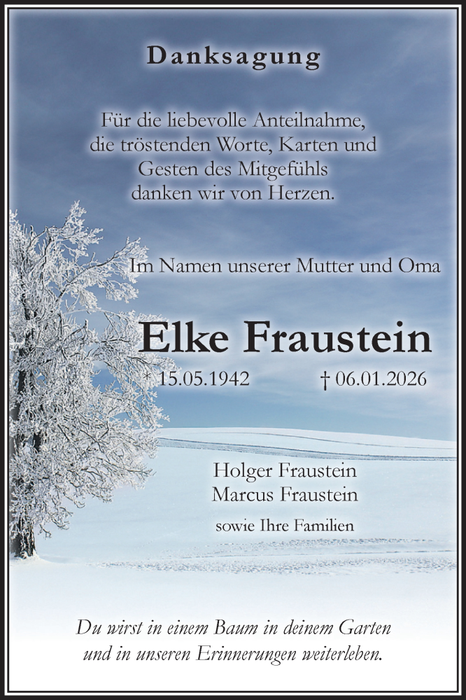 Hier finden Sie alle Traueranzeigen aus der Zeitung, die bisher für Elke Fraustein erschienen sind. Weitere Traueranzeigen, die in der Zeitung erscheinen, werden hier ebenfalls aufgelistet