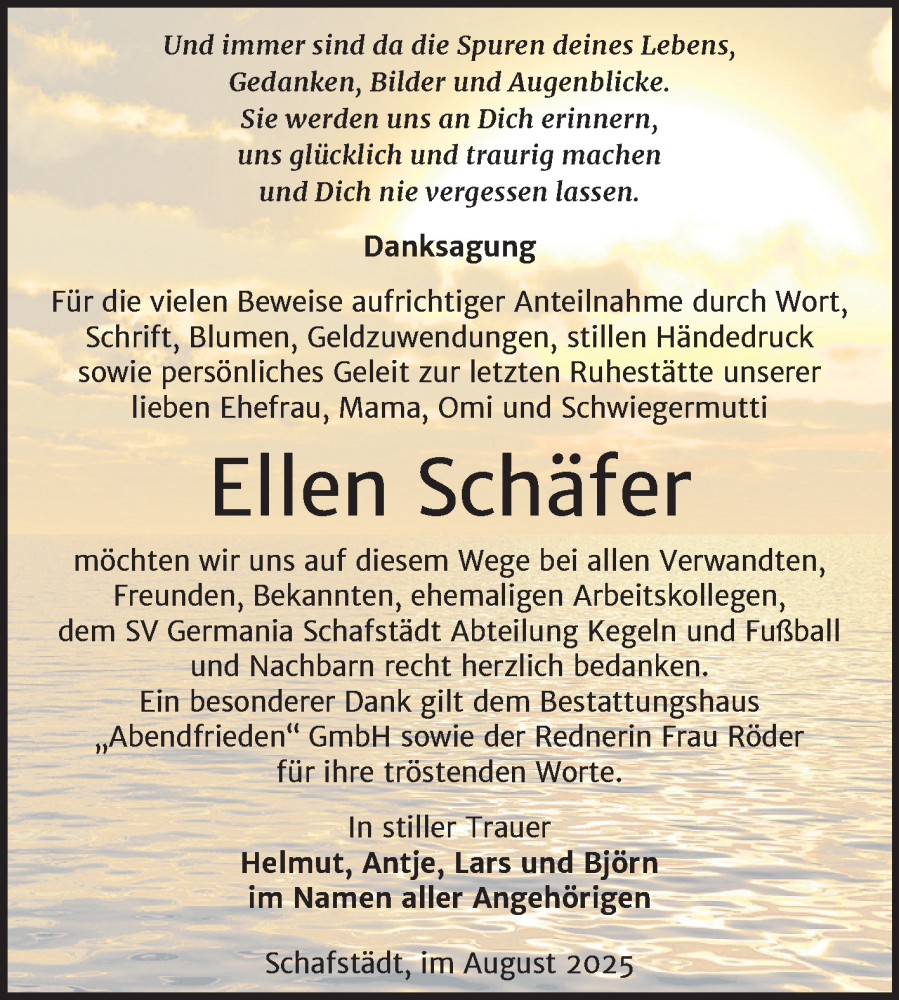 Hier finden Sie alle Traueranzeigen aus der Zeitung, die bisher für Ellen Schäfer erschienen sind. Weitere Traueranzeigen, die in der Zeitung erscheinen, werden hier ebenfalls aufgelistet