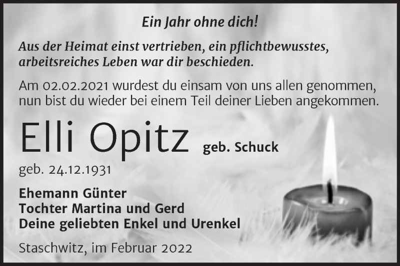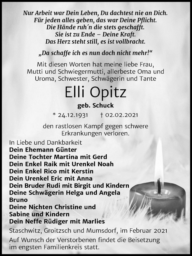 Hier finden Sie alle Traueranzeigen aus der Zeitung, die bisher für Elli Opitz erschienen sind. Weitere Traueranzeigen, die in der Zeitung erscheinen, werden hier ebenfalls aufgelistet