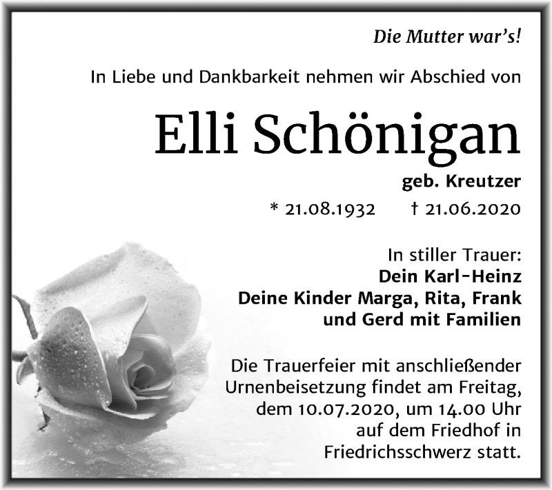Hier finden Sie alle Traueranzeigen aus der Zeitung, die bisher für Elli Schönigan erschienen sind. Weitere Traueranzeigen, die in der Zeitung erscheinen, werden hier ebenfalls aufgelistet