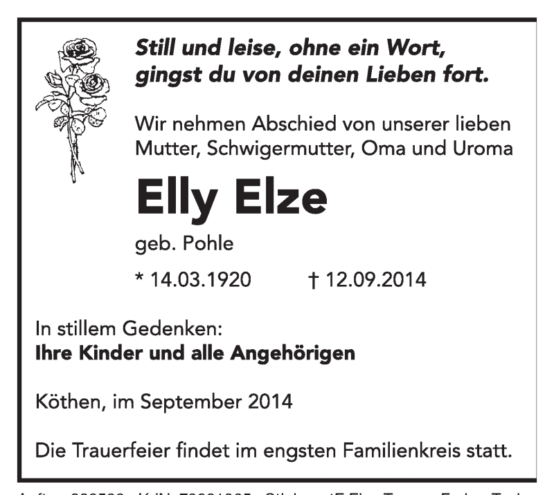 Hier finden Sie alle Traueranzeigen aus der Zeitung, die bisher für Elly Elze erschienen sind. Weitere Traueranzeigen, die in der Zeitung erscheinen, werden hier ebenfalls aufgelistet