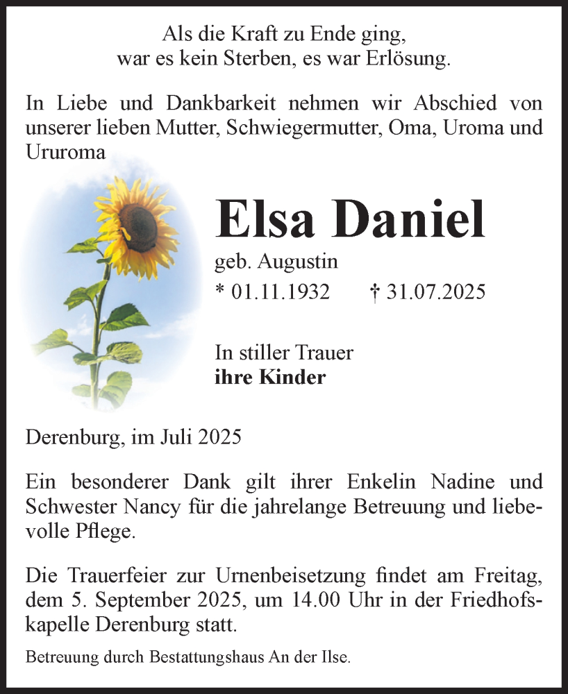 Hier finden Sie alle Traueranzeigen aus der Zeitung, die bisher für Elsa Daniel erschienen sind. Weitere Traueranzeigen, die in der Zeitung erscheinen, werden hier ebenfalls aufgelistet