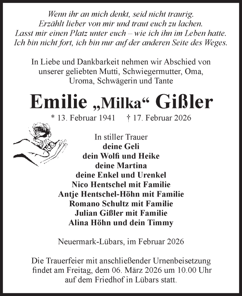 Hier finden Sie alle Traueranzeigen aus der Zeitung, die bisher für Emilie Gißler erschienen sind. Weitere Traueranzeigen, die in der Zeitung erscheinen, werden hier ebenfalls aufgelistet