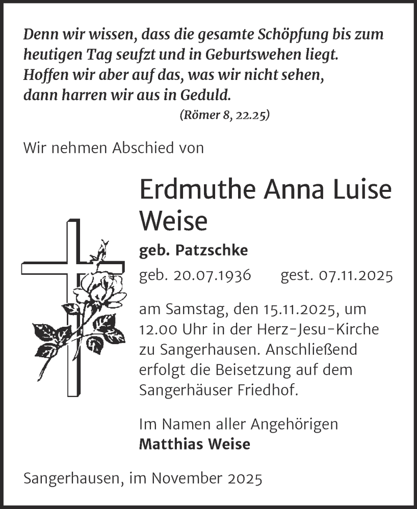 Hier finden Sie alle Traueranzeigen aus der Zeitung, die bisher für Erdmuthe Anna Luise Weise erschienen sind. Weitere Traueranzeigen, die in der Zeitung erscheinen, werden hier ebenfalls aufgelistet